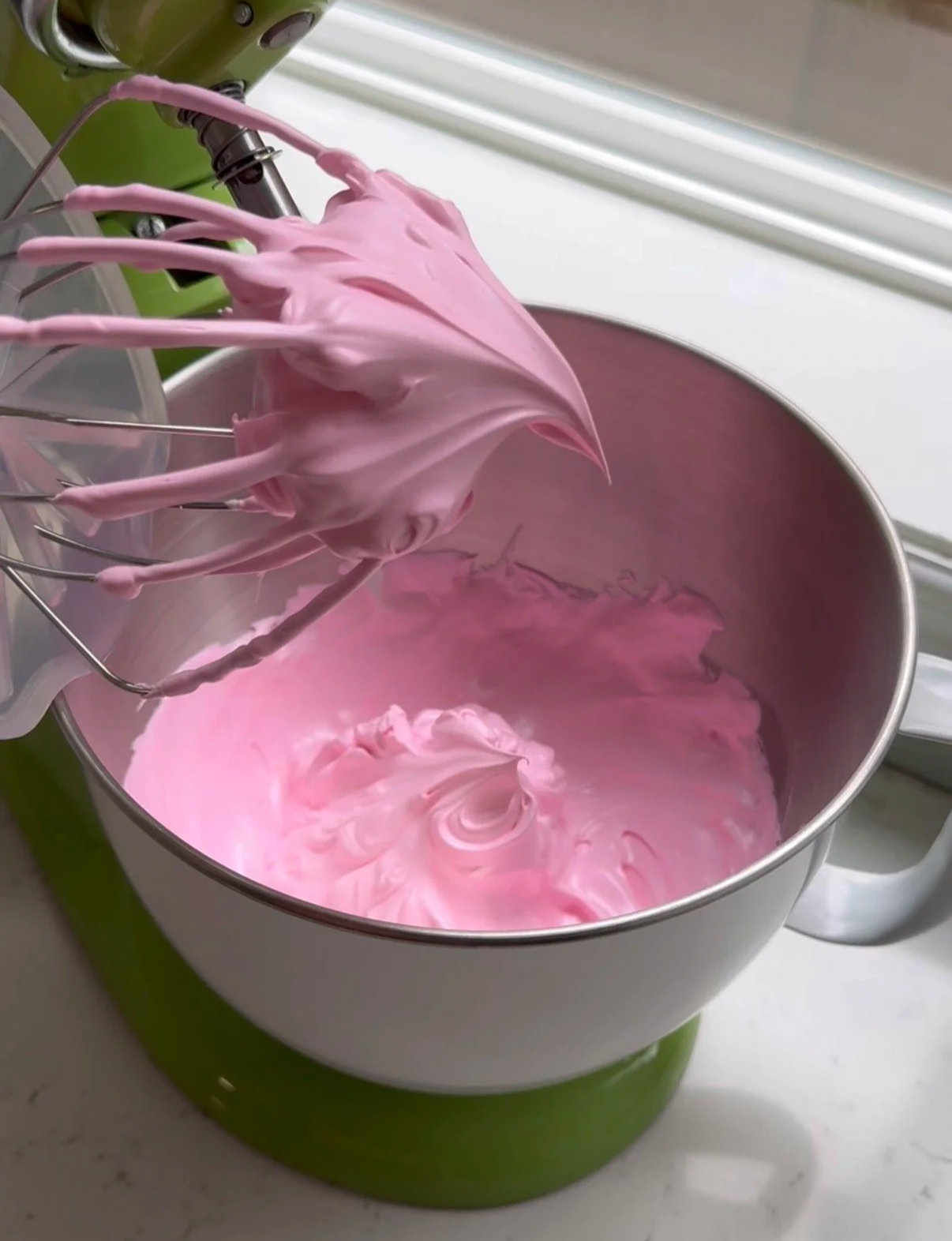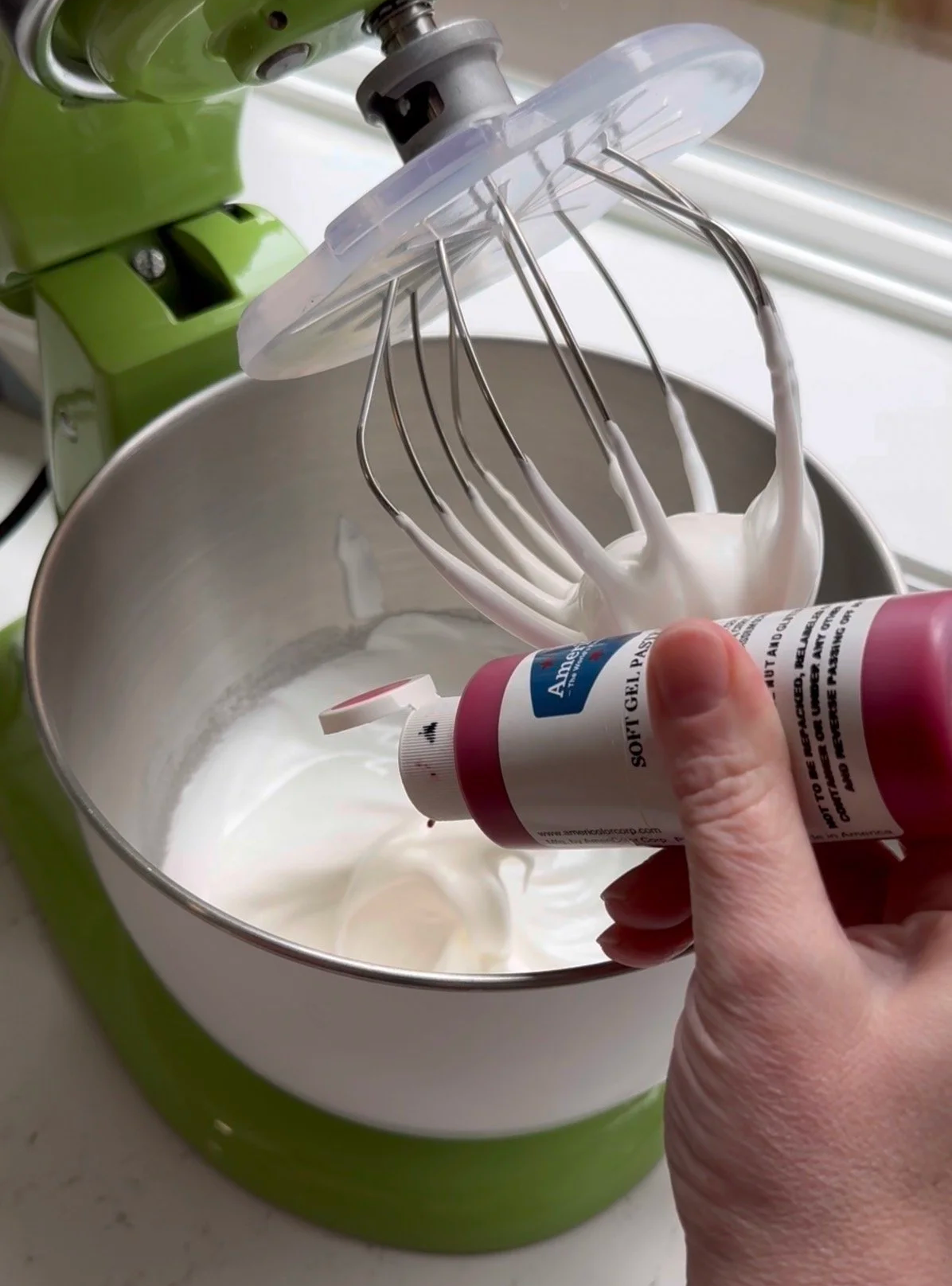 - Remove the whisk and swirl it around the bowl to check for stiff peaks. Add gel color and mix to combine (do not over mix).