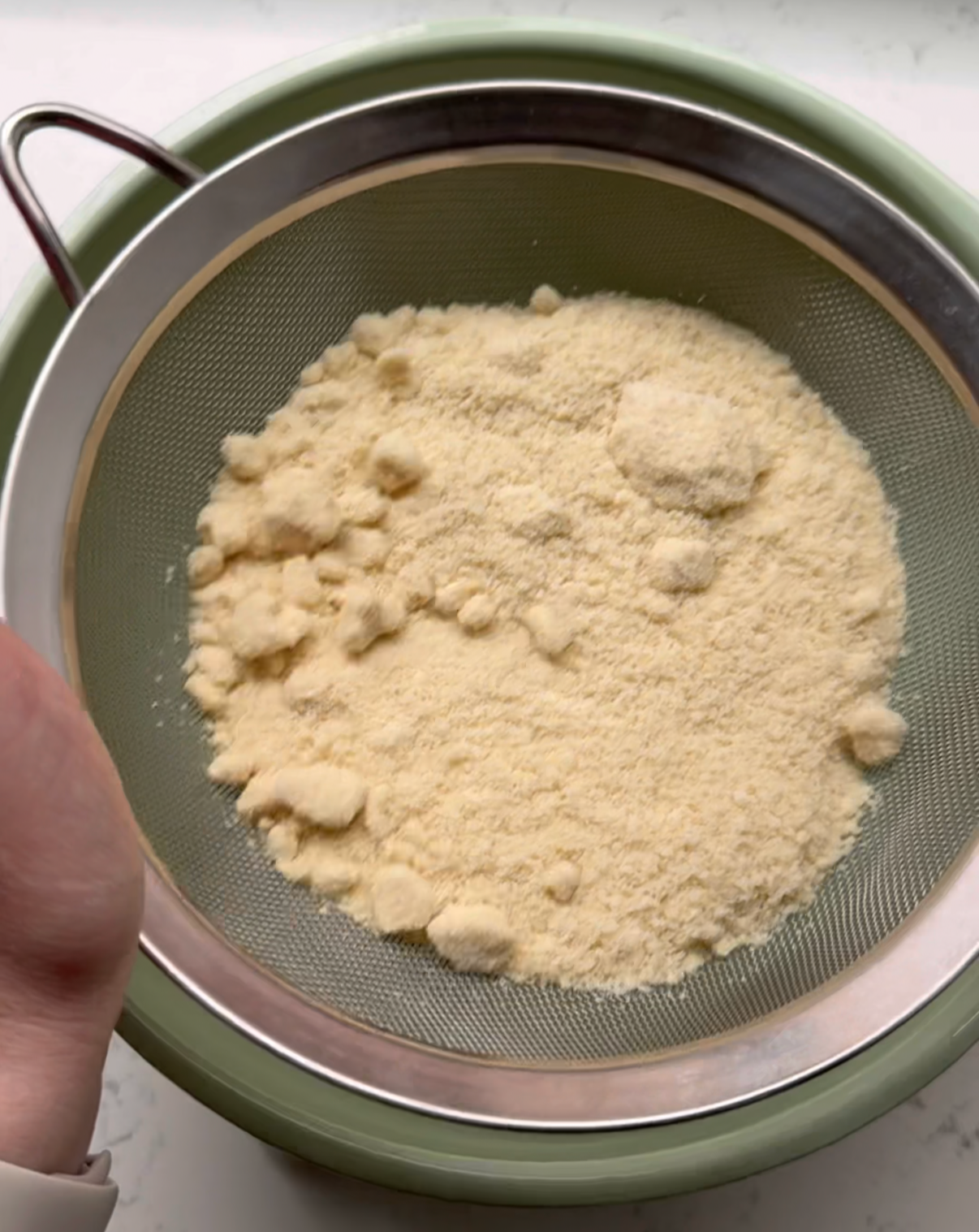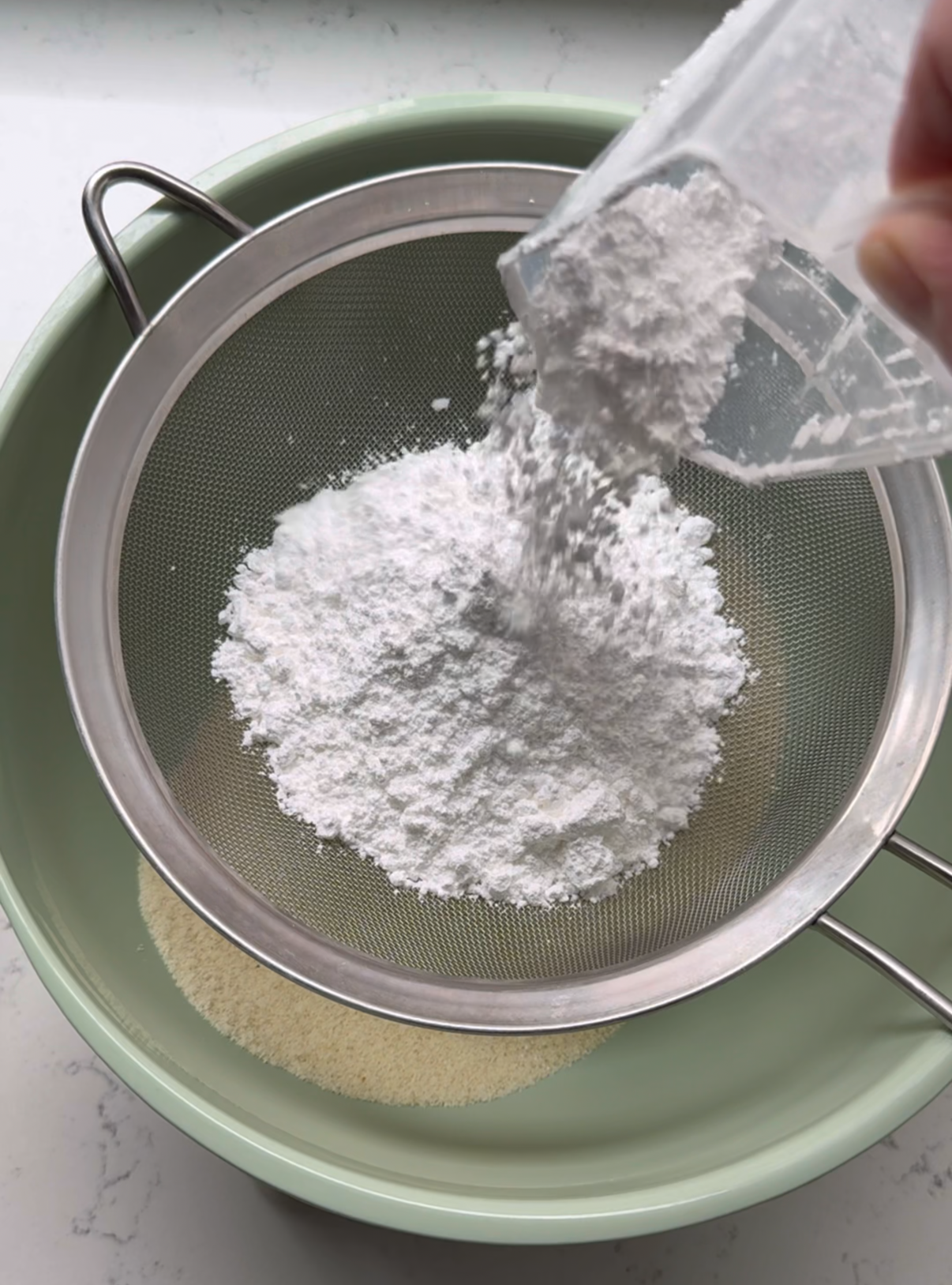- Sift the almond flour and powdered sugar together and combine with a whisk. Set aside.