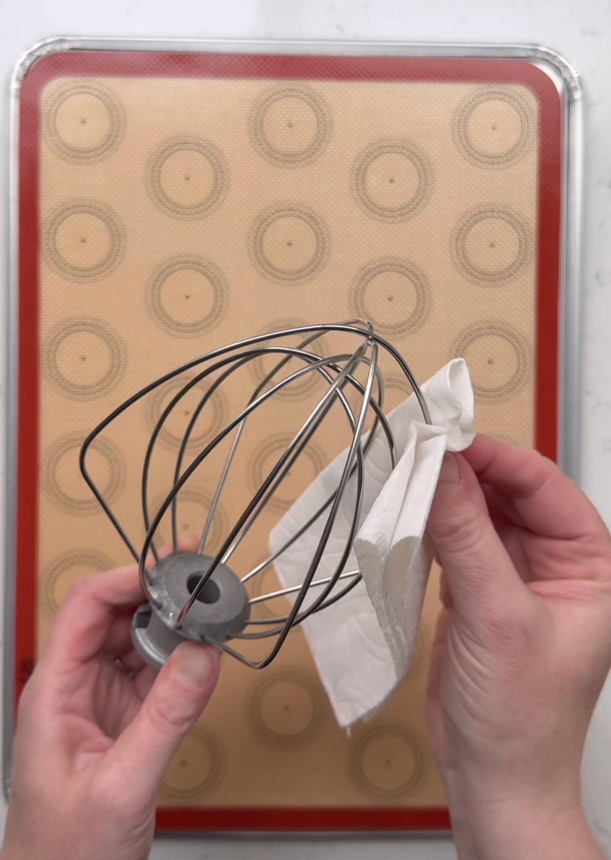 - Wipe down your mixing bowl, whisk, silicone mat, spatula, and piping tip with white vinegar to remove any oils or residue that can ruin your meringue.