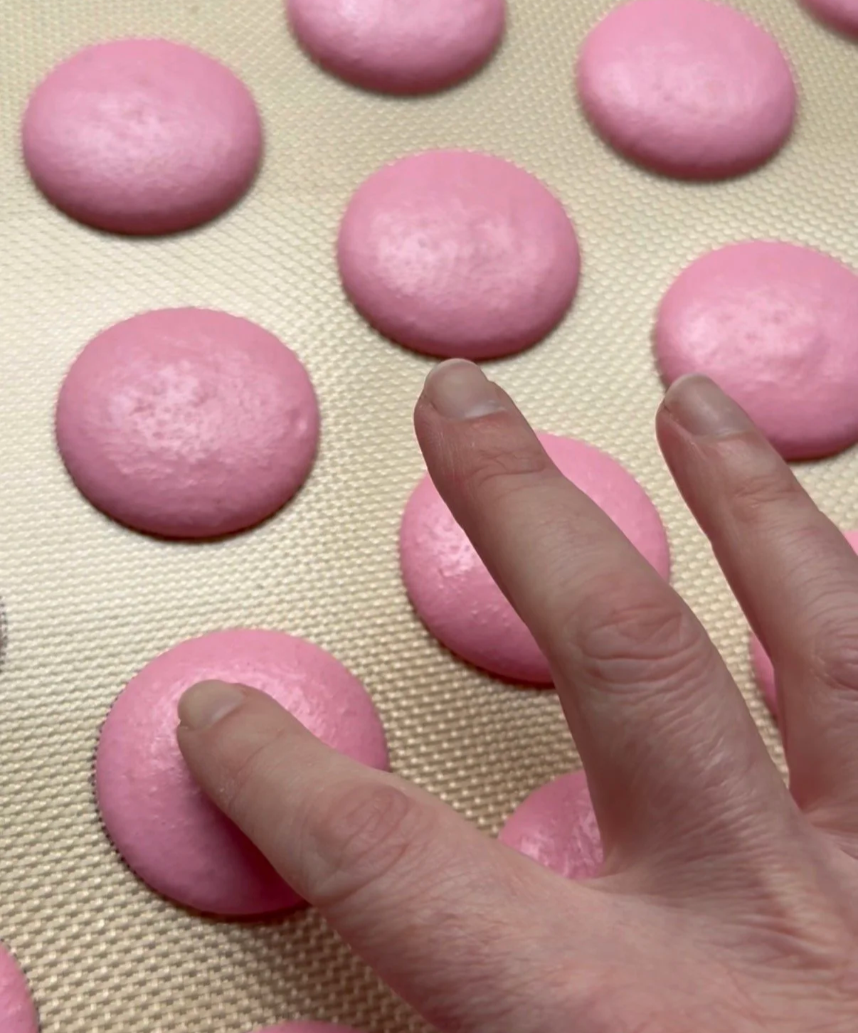 Let the macarons rest on the tray until they have formed a skin. You should be able to gently touch the top without having any batter stick to your finger. This will take anywhere from 15-60 minutes depending on the level of humidity where you live. This step is crucial for getting feet and avoiding cracked/volcano tops on your macarons.