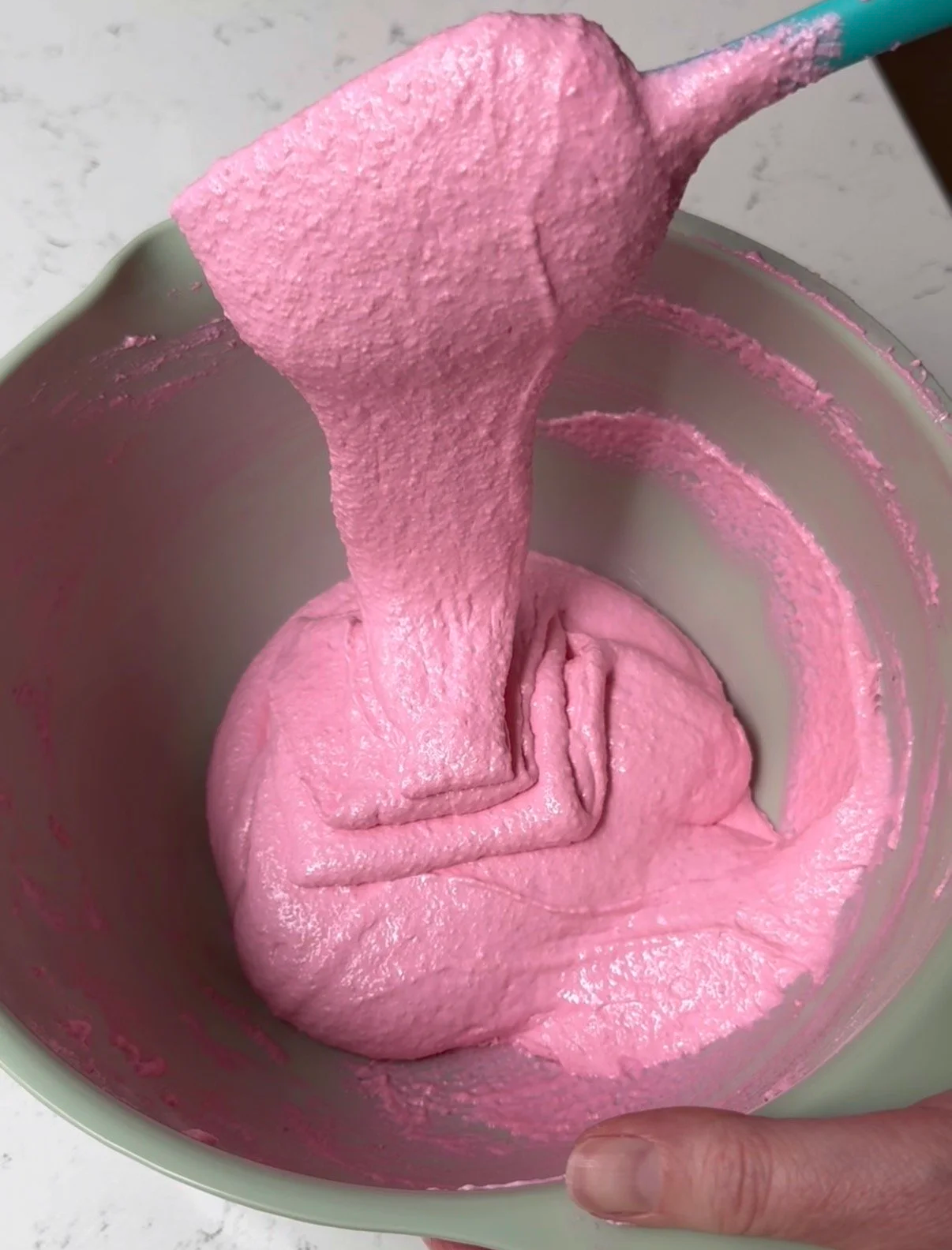 Continue this process until the batter flows off the spatula in a continuous ribbon and settles back into itself in the bowl.
