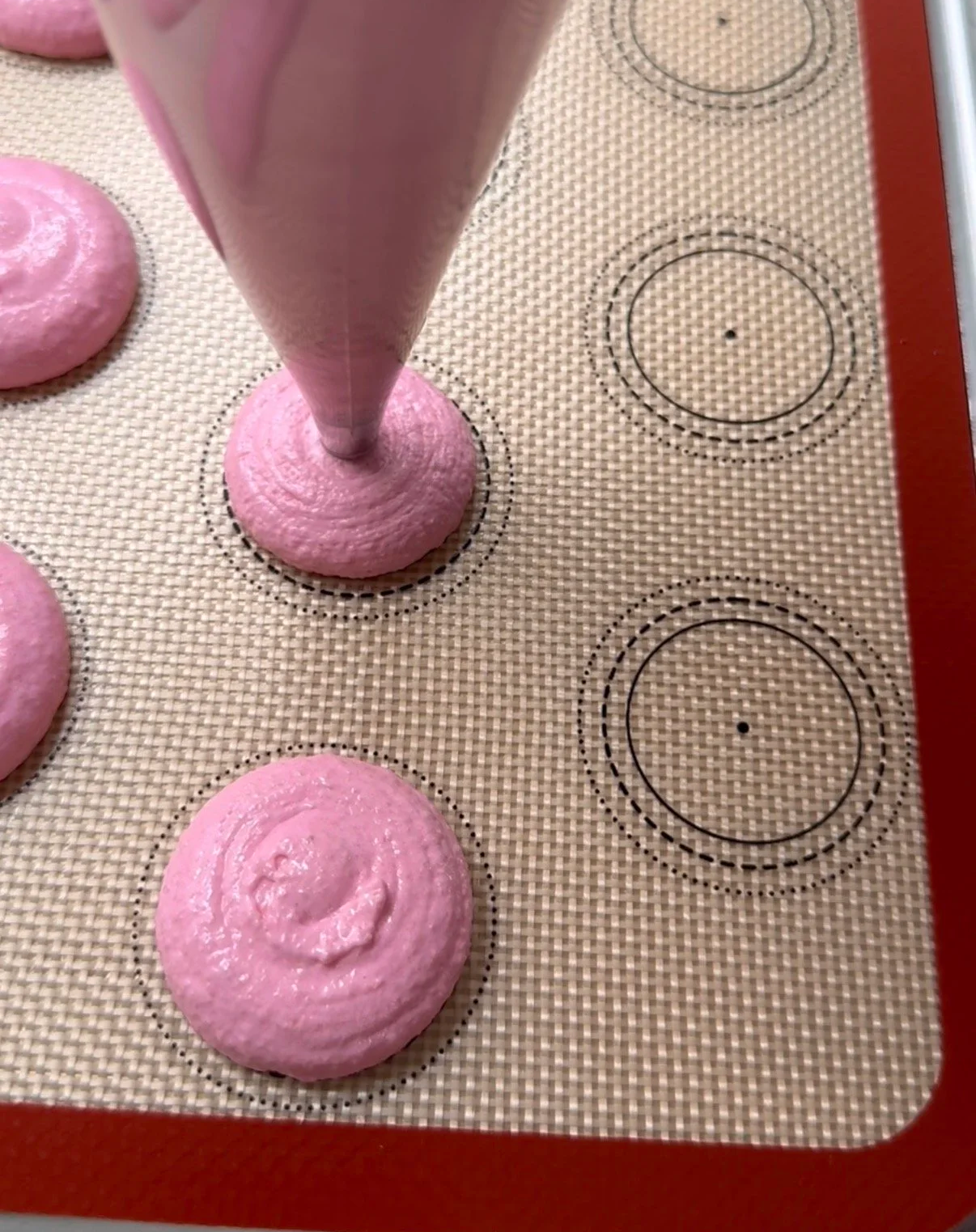 Hold your piping bag vertically with the tip over the center of the circle. Squeeze the bag until enough batter flows out to reach the edge of the circle. Release the pressure on the bag and make a swirling motion with the piping tip as you lift up.